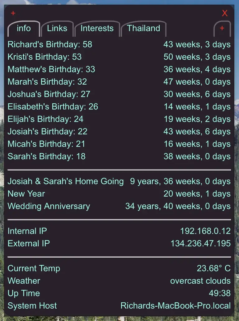 ScriptBar est un programme pour afficher la sortie de scripts ou d'un serveur Node-Red. Il exécute des scripts définis dans le programme EmailIt et affiche la sortie. Des scripts de xBar ou TextBar peuvent être utilisés. Actuellement sur les scripts TextBar fonctionnent bien. Il affiche également la sortie des scripts sur votre système. ScriptBar ne les met pas dans la barre de menus, mais les a tous dans une fenêtre convenable pour une visualisation facile. Vous pouvez avoir plusieurs onglets pour voir plusieurs choses différentes. Vous pouvez également conserver les liens vers vos sites Web les plus visités.